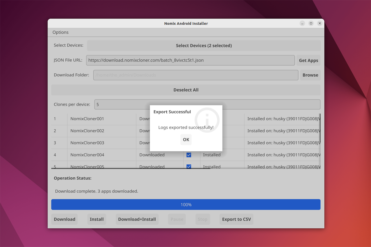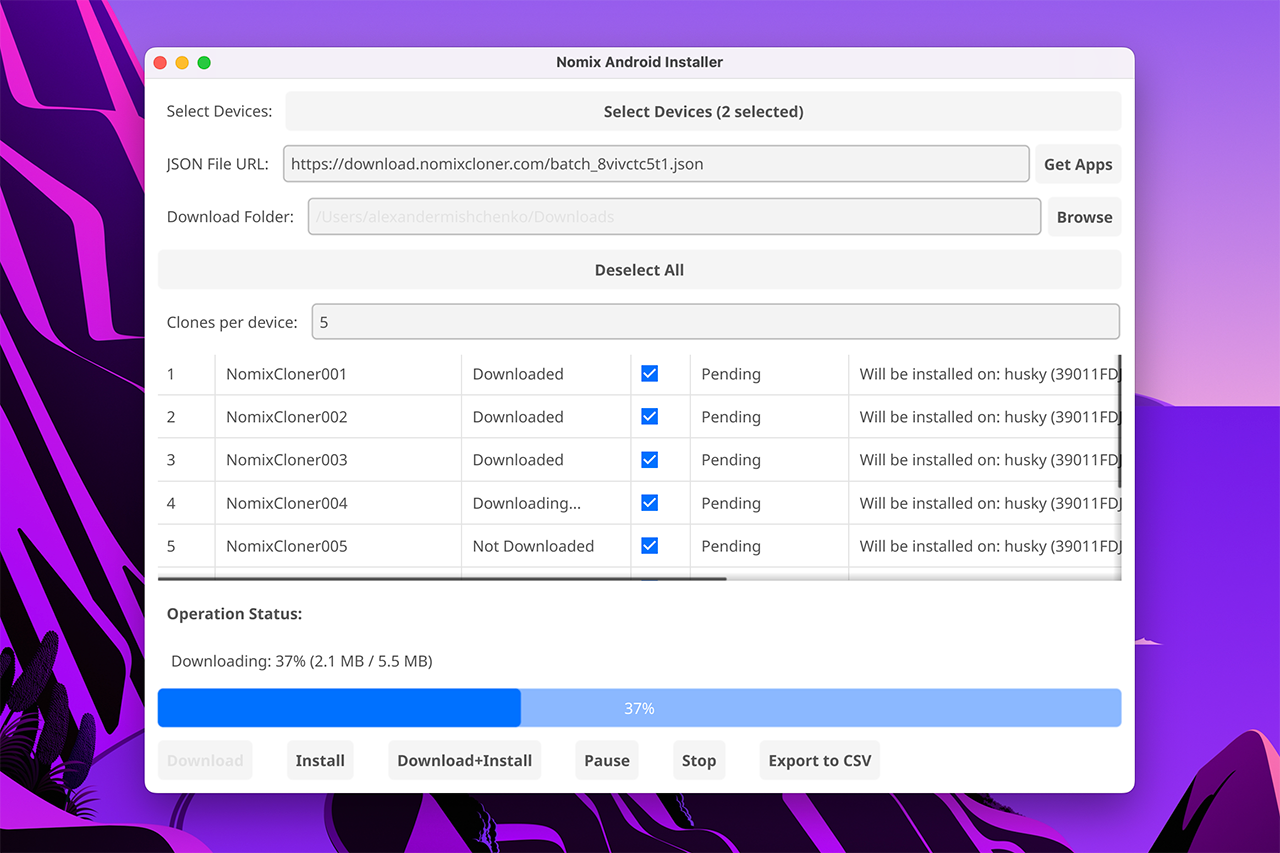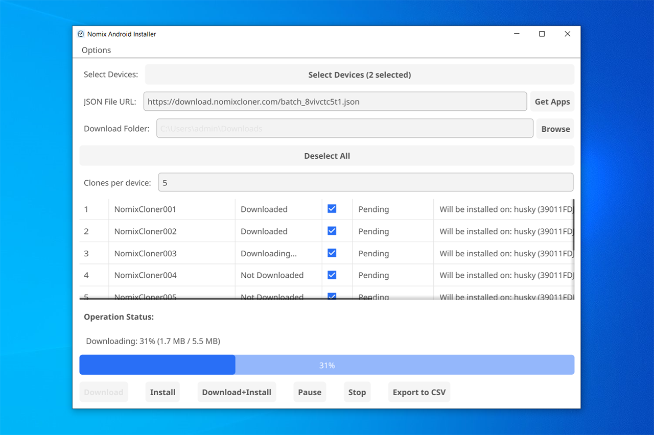 Batch cloning is the best tool for mass-installing and mass-updating apps on the phones. It supports all desktop operation systems: Windows, Linux, macOS. It allows to specify all parameters similar to the NomixCloner bot interface. Downloaded clones will be stored on your PC until you delete them (or until you do Options → Clear Cache). After a successful installation it provides a convenient technical summary in the format of CSV table for automation systems.