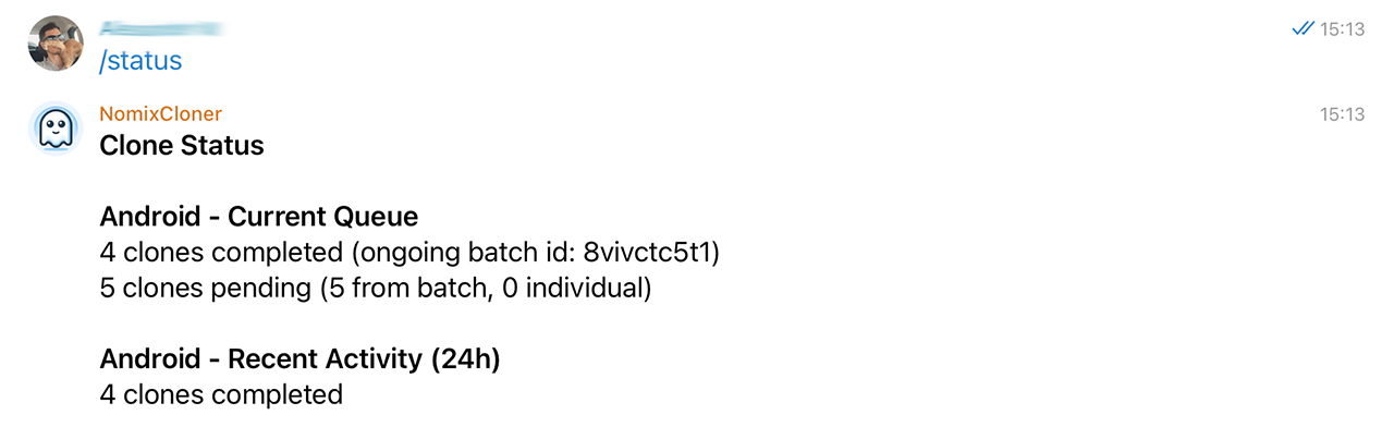 At every moment of time you can use /status command to see the progress of your batch cloning.